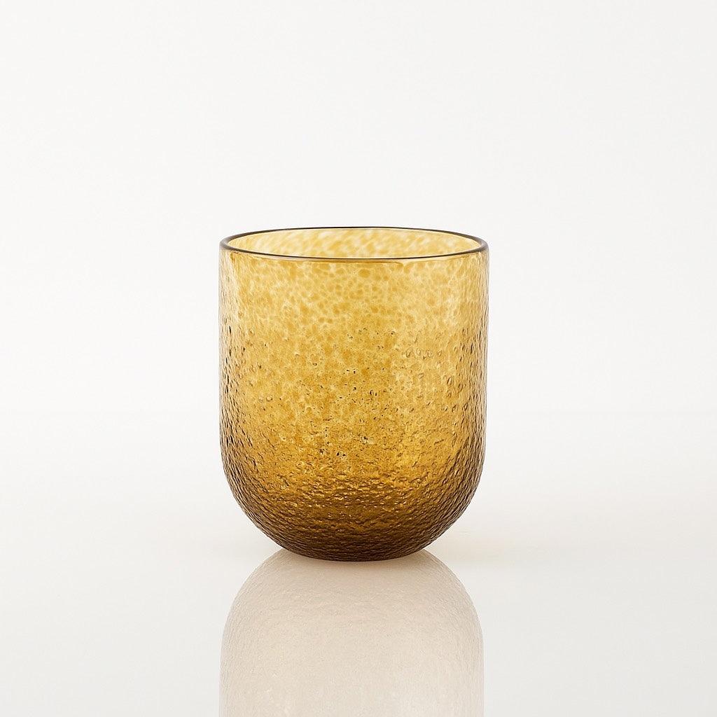 De petits grains de verre coloré ornent la surface, créant une texture subtile et un délicat jeu de lumière.